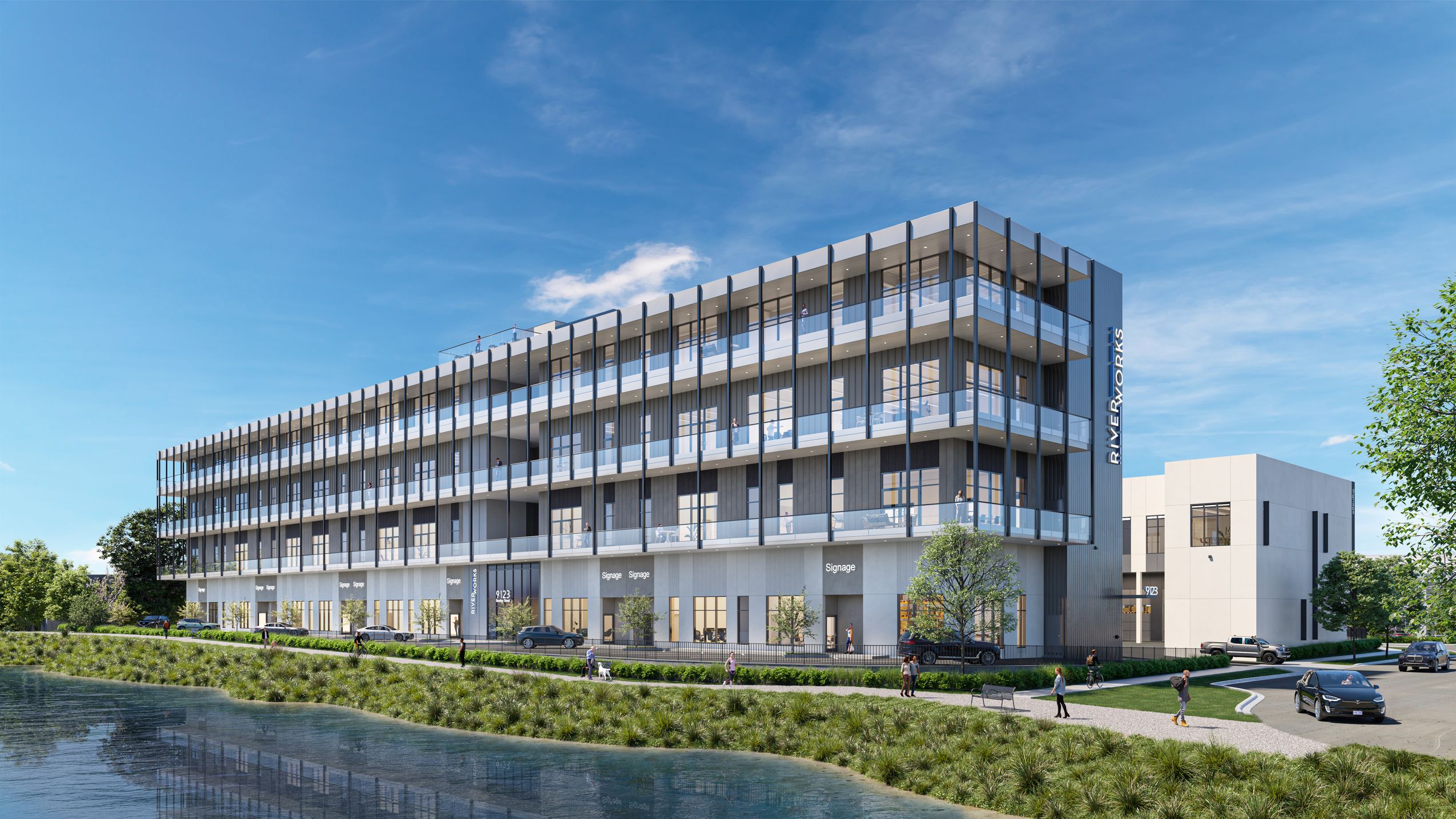 Features include a rooftop amenity deck with an outdoor kitchen and BBQ, convenient end-of-trip facilities with lockers, washrooms, and showers, a secure bike storage room with charging capabilities for e-bikes, surface parking with EV outlets, and a beautifully landscaped walking path that spans the riverscape.